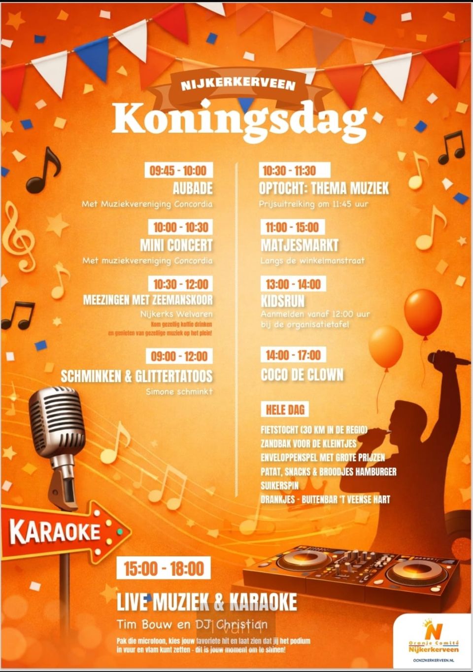Op maandag 27 april viert Nijkerkerveen Koningsdag met een uitgebreid programma voor jong en oud vol muziek, activiteiten en gezelligheid.