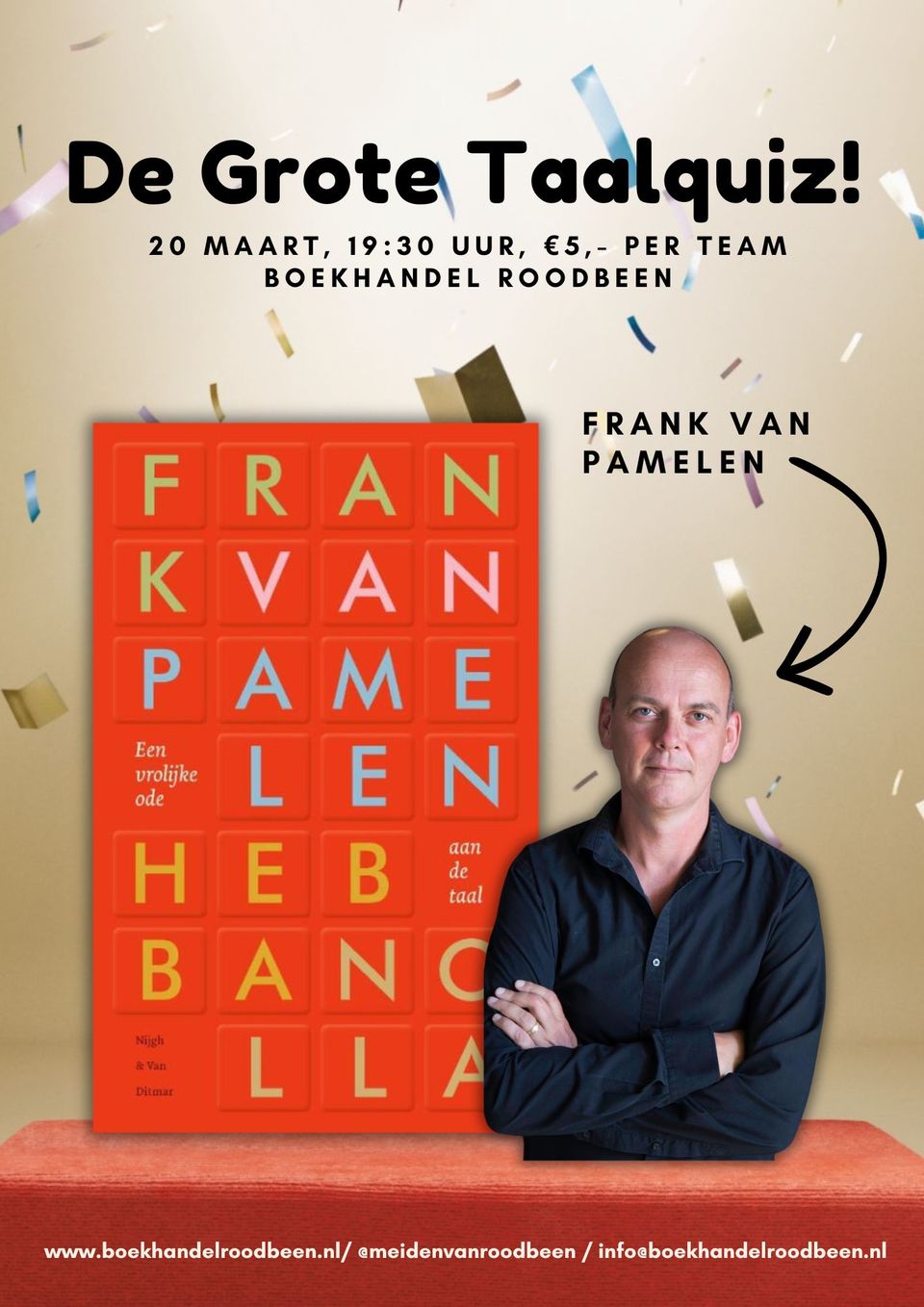 Op vrijdagavond 20 maart verandert Boekhandel Roodbeen in een quizarena voor liefhebbers van de Nederlandse taal. Samen met Frank van Pamelen organiseren we een gezellige pubquiz rond taal, woorden en taalgrapjes, geïnspireerd door zijn boek Hebba Nolla.