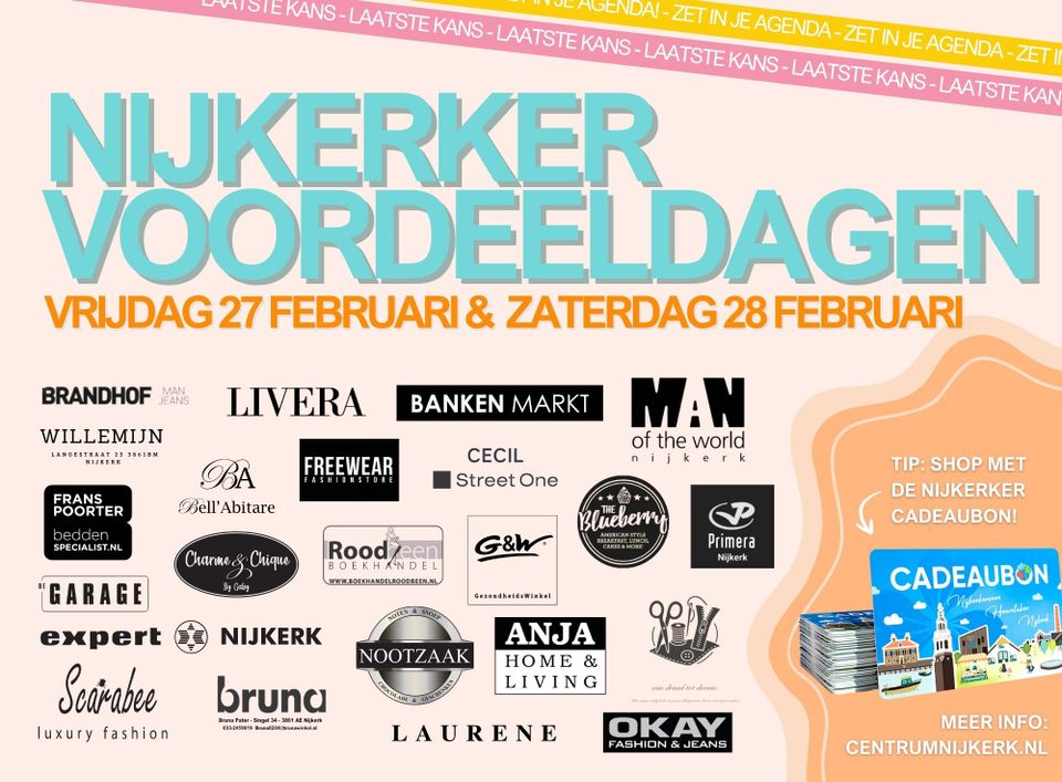 Vrijdag 27 en zaterdag 28 februari is het tijd om je voordeel te pakken in de binnenstad van Nijkerk. De winkels pakken uit met scherpe aanbiedingen, leuke acties en natuurlijk volop gezelligheid.